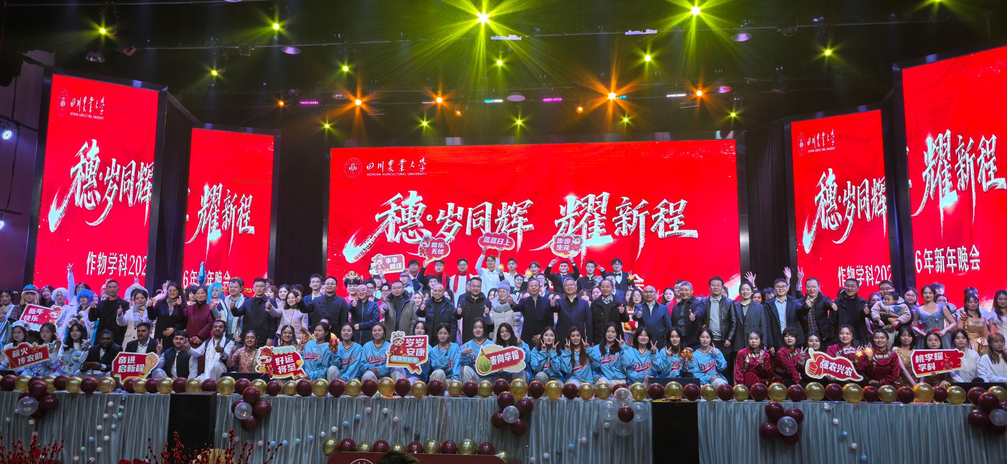 12 月 30 日晚,麦立方内灯火璀璨、暖意融融,由小麦研究所主办,农学院、水稻研究所、玉米研究所、国家重点实验室协办的四川农业大学作物学科“穗・岁同辉耀新程”2026年新年晚会浓情上演。研究生工作部部长李武生,四川天宇种业总经理方友斌、四川隆鼎金穗农业有限公司总经理张友强、四川杰莱美科技有限公司全国销售总监路洁霏,作物学科各单位主要领导,专家教授代表李仕贵、马均、王西瑶等与作物学科师生代表1000余人齐聚一堂,共赴这场融汇学科情怀与奋进力量的年度温情盛典,向学校 120 周年华诞献上诚挚祝福。