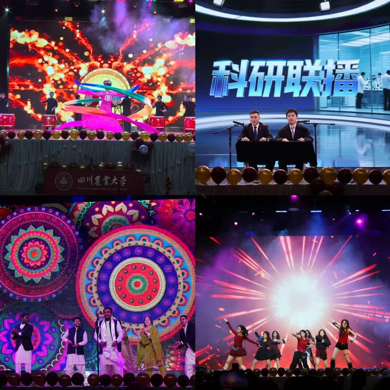 晚会以作物的生命历程与科研人的成长轨迹为双线脉络,紧扣“扎根、生长、丰收、展望”的核心脉络,分为“向心出发·炽热启程”“向下扎根·沃土情缘”“向上生长·穗月韶华”“向阳丰收·锦绣征程”“向远而行·情暖迎新”五个篇章。节目既展青春朝气,又显传承底色:开场舞《我的未来式》以动感旋律与灵动舞姿,点燃青年学子的蓬勃活力;表演唱《种子》、合唱《落叶归根》,传递出作物学人对土地的赤诚与初心的坚守;音诗画《如愿》则以声画交织,勾勒出农科学人代代薪火相传的使命担当;科研风尚秀《我们的秀场》、相声《科研“联播”》,以趣味形式诠释科研日常;歌曲串烧《光阴的故事》串联逐梦岁月的温暖;流行舞串烧、留学生节目《Pakistani Bhangra Bash》,让现场氛围持续升温;压轴鼓扇舞《鼓韵惊鸿》,更以刚柔并济的舞姿,舞出丰收图景与奋进豪情。其间穿插的绿苗启新奖、沃土纳福奖、嘉禾迎春奖和金穗贺岁奖抽奖互动环节,不断点燃现场热情。终章大合唱《星辰大海》《相亲相爱一家人》,唱出了师生携手同行的真挚情谊,满含对学校未来的美好憧憬与对学科发展的坚定信心。