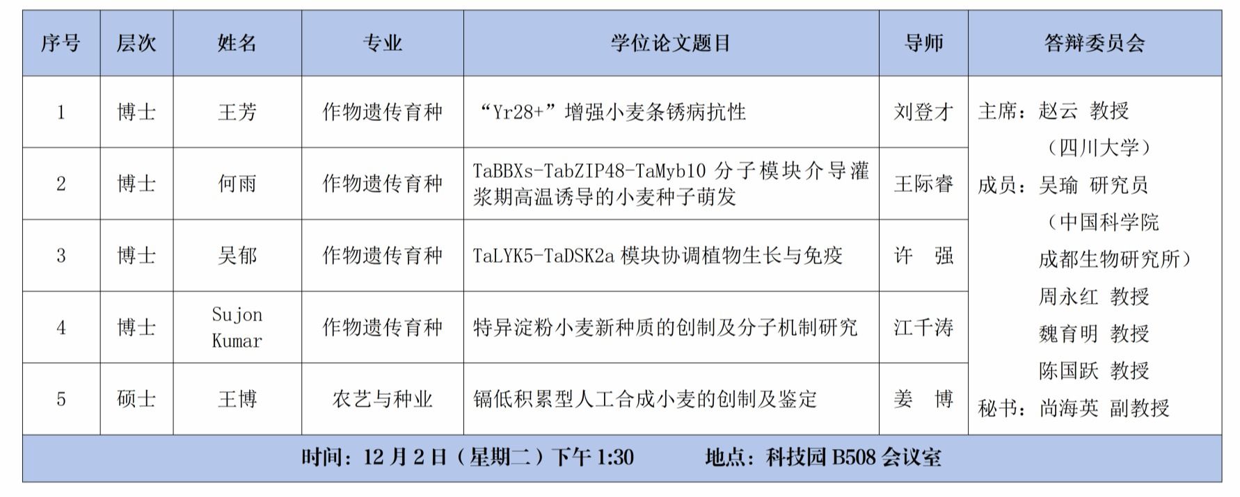 小麦研究所2025年冬季博士硕士学位论文答辩安排