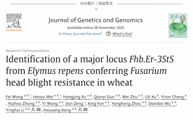 2025年11月28日,Journal of Genetics and Genomics在线发表四川农业大学小麦研究所康厚扬教授团队题为“Identification of a major locus Fhb.Er-3StS from Elymus repens conferring Fusarium head blight resistance in wheat”的研究论文。该研究发掘了偃麦草(Elymus repens) 3St染色体短臂端部片段上的抗小麦赤霉病位点Fhb.Er-3StS,并创制抗病的小麦-偃麦草易位系,为小麦抗赤霉病育种提供重要基因资源和育种材料。