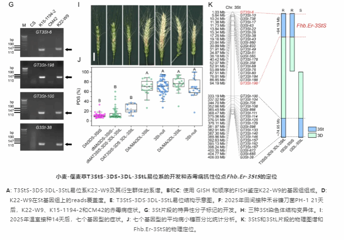 研究团队前期利用高抗赤霉病的小麦-偃麦草部分双二倍体P1142-1-2与普通小麦杂交,创制了抗赤霉病的易位系K15-1194-2。该材料携带7D·St和St-3D-St两种易位染色体,其中7D·St易位已被鉴定为T7DS·7StL,是主效的赤霉病抗源。该研究在K15-1194-2/川麦42的F3:4群体中鉴定到St-3D-St易位系K22-W9,其在两年的温室和田间赤霉病抗性评价中均表现出稳定抗性。液相芯片和细胞遗传学分析表明St-3D-St易位为T3StS-3DS·3DL-3StL。随后基于基因组简化测序数据开发了41个3St特异的分子标记,并构建一个覆盖3StS和3StL片段的物理图谱。在F2和F2:3群体中的遗传效应分析表明,T3StS-3DS·3DL-3StL与赤霉病抗性连锁。进一步通过群体筛选获得3StS与3StL片段分离的染色体结构变异体,其中3DL-3StL端体/等臂染色体系均表现为高感赤霉病,而3DS-3StS端体系表现为高抗赤霉病,说明抗性位点位于3St染色体短臂片段。通过分子标记分析,进一步将该抗性位点定位到对应3St参考基因组0~94.19Mb区间,初步命名为Fhb.Er-3StS。随后利用双顶交-两段选择育种技术获得127份携带Fhb.Er-3StS且农艺性状优良的小麦育种中间材料。