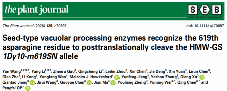 Wang, Y., Li, Y., Guo, Z.R., Li, Q.C., Zhou, L.L., Chen, X., Deng, J., Yuan, X., Chen, L.R., Zha, Q., Kong, L., Wan, Y.F., Hawkesford M.J., Jiang, Y.F., Zhang, Y.Z., Xu, Q., Jiang, Q.T., Wang, J.R., Chen, G.Y., Ma, J., Zheng, Y.L., Wei, Y.M. and Qi, P.F. (2026) Seed-type vacuolar processing enzymes recognize the 619th asparagine residue to posttranslationally cleave the HMW-GS 1Dy10-m619SN allele. The Plant Journal, 125, e70697.
